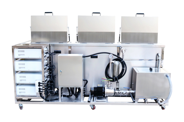 本設備采用優(yōu)質不銹鋼氬弧焊接制成,由超聲波清洗槽加循環(huán)過濾裝置、高壓噴淋、熱風烘干三大部分組成。循環(huán)過濾裝置可過濾漂浮在清洗液體表面的油污和雜質,減少清洗液的更換次數(shù),節(jié)約清洗成本。具備加熱(常溫-95°可設置)、定時(0-99H可調)等功能。底部安裝工業(yè)級超聲波換能器,電聲轉換效率高,清洗力度強勁。